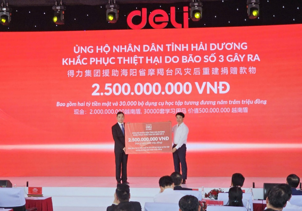 Ngày 28-9, thông qua Ủy ban Mặt trận Tổ quốc tỉnh Hải Dương, Tập đoàn Deli đã trao tặng 2,5 tỉ đồng, bao gồm 2 tỉ đồng tiền mặt và 30.000 bộ dụng cụ học tập cho học sinh, nhằm hỗ trợ người dân vượt qua khó khăn và sớm ổn định cuộc sống.