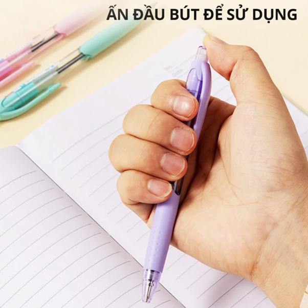 - Cơ chế bấm tiện lợi: Thiết kế dạng bấm lò xo giúp bạn sử dụng nhanh chóng chỉ bằng một ngón tay, loại bỏ hoàn toàn nỗi lo làm rơi hay mất nắp bút.