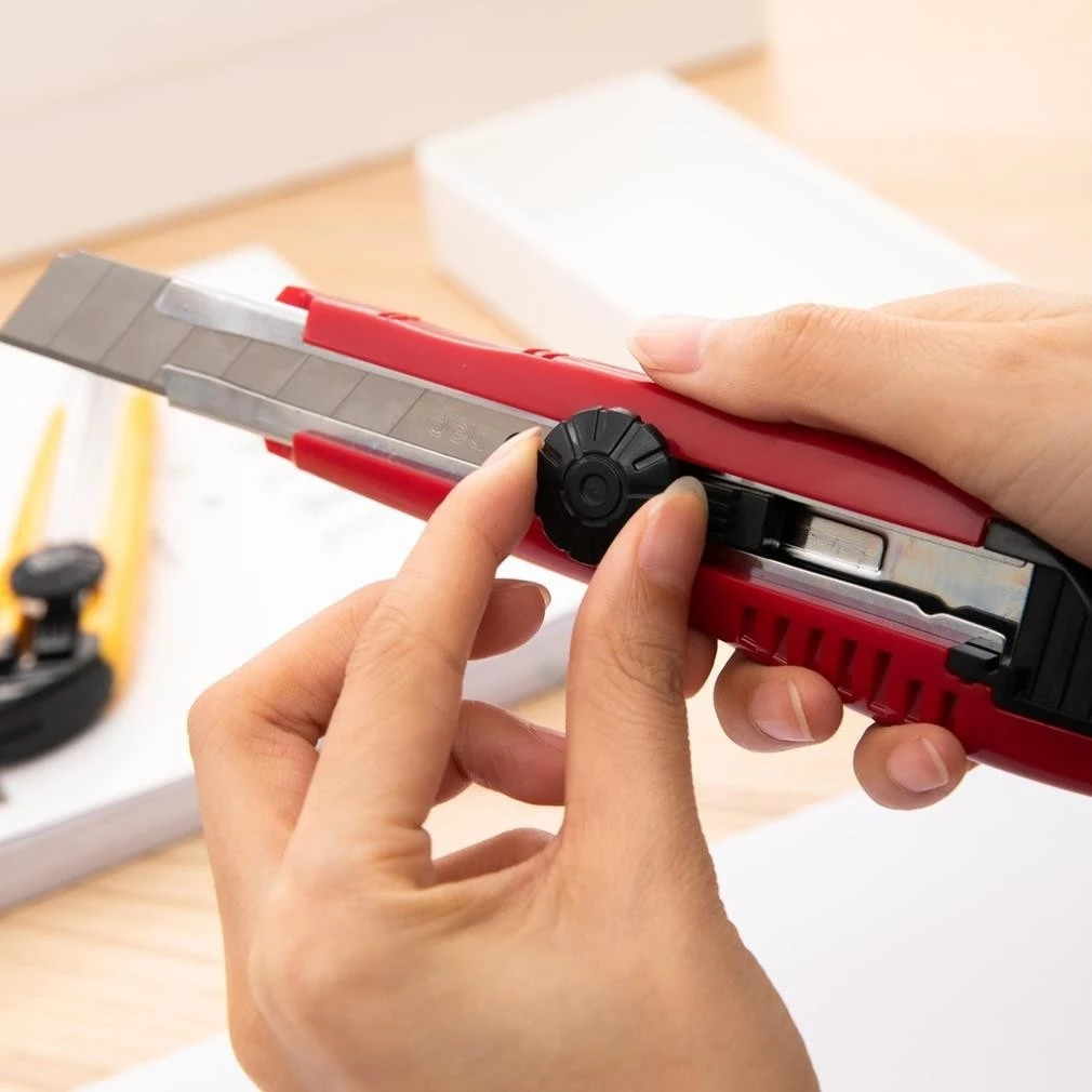 Cơ chế trượt nhẹ nhàng: Thanh trượt trên thân dao hoạt động trơn tru, giúp bạn dễ dàng đẩy lưỡi dao ra hoặc thu vào tùy theo nhu cầu sử dụng. Các nấc khóa giúp cố định lưỡi dao chắc chắn khi cắt, đảm bảo an toàn.