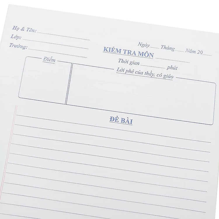 Thiết kế tiện lợi, chuẩn quy định: Giấy được in sẵn khung điểm, lời phê của giáo viên và các dòng thông tin cá nhân (Họ tên, Lớp, Môn…) một cách rõ ràng, khoa học. Học sinh chỉ việc điền vào và làm bài ngay, không mất thời gian kẻ vẽ, giúp tập trung tối đa vào nội dung bài thi.