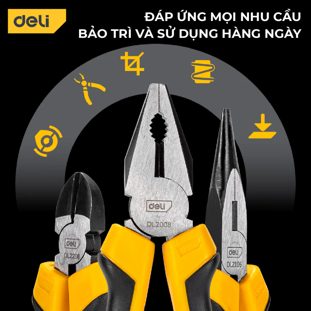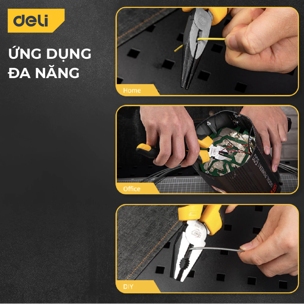 Kìm điện Deli EDL2008 là dụng cụ “đa-zi-năng” 3 trong 1 không thể thiếu trong mọi hộp đồ nghề, từ gia đình cho đến công trường. Với kích thước 8 inch (200mm) mạnh mẽ, sản phẩm kết hợp hoàn hảo giữa khả năng kẹp giữ chắc chắn, cắt dây sắc bén và hỗ trợ tuốt vỏ dây, giúp bạn xử lý các công việc sửa chữa điện, cơ khí một cách nhanh gọn và chuyên nghiệp.