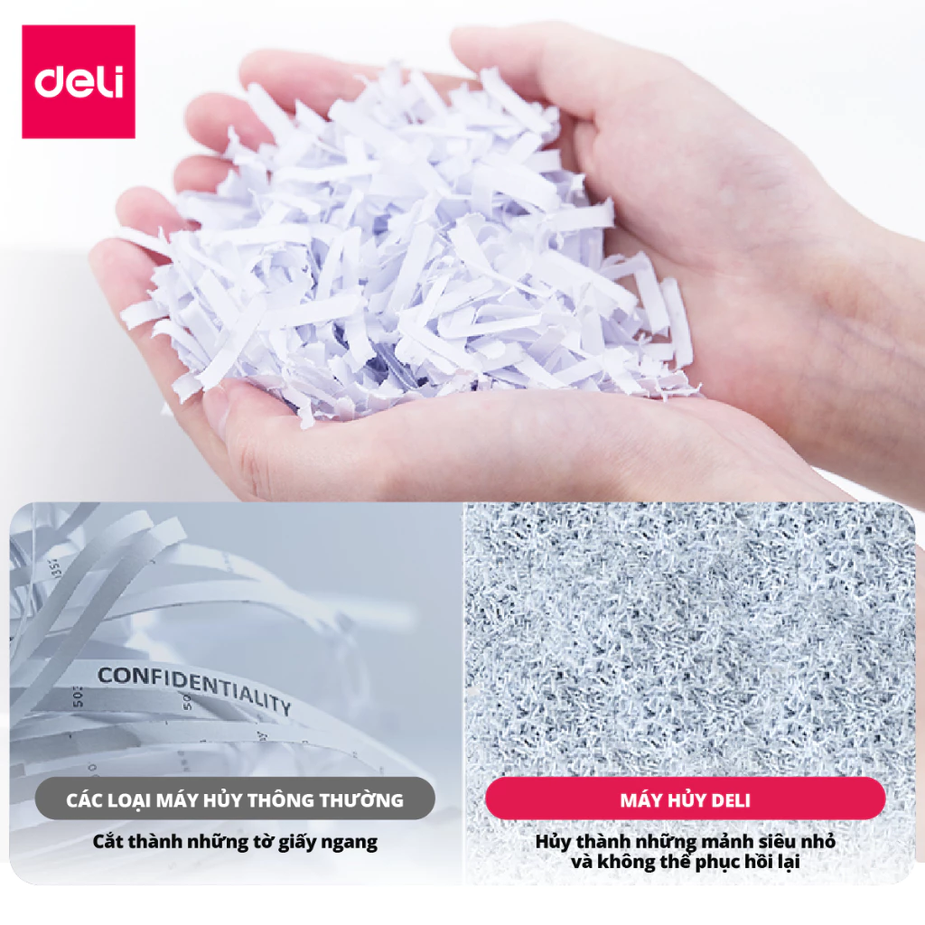 - Bảo mật cấp độ cao (Hủy vụn): Máy cắt giấy thành những mảnh vụn kích thước nhỏ (khoảng 4x25mm), khiến việc ghép lại nội dung gần như là không thể. Đây là tiêu chuẩn bảo mật cần thiết cho các hợp đồng, báo cáo tài chính hay hồ sơ nhân sự.