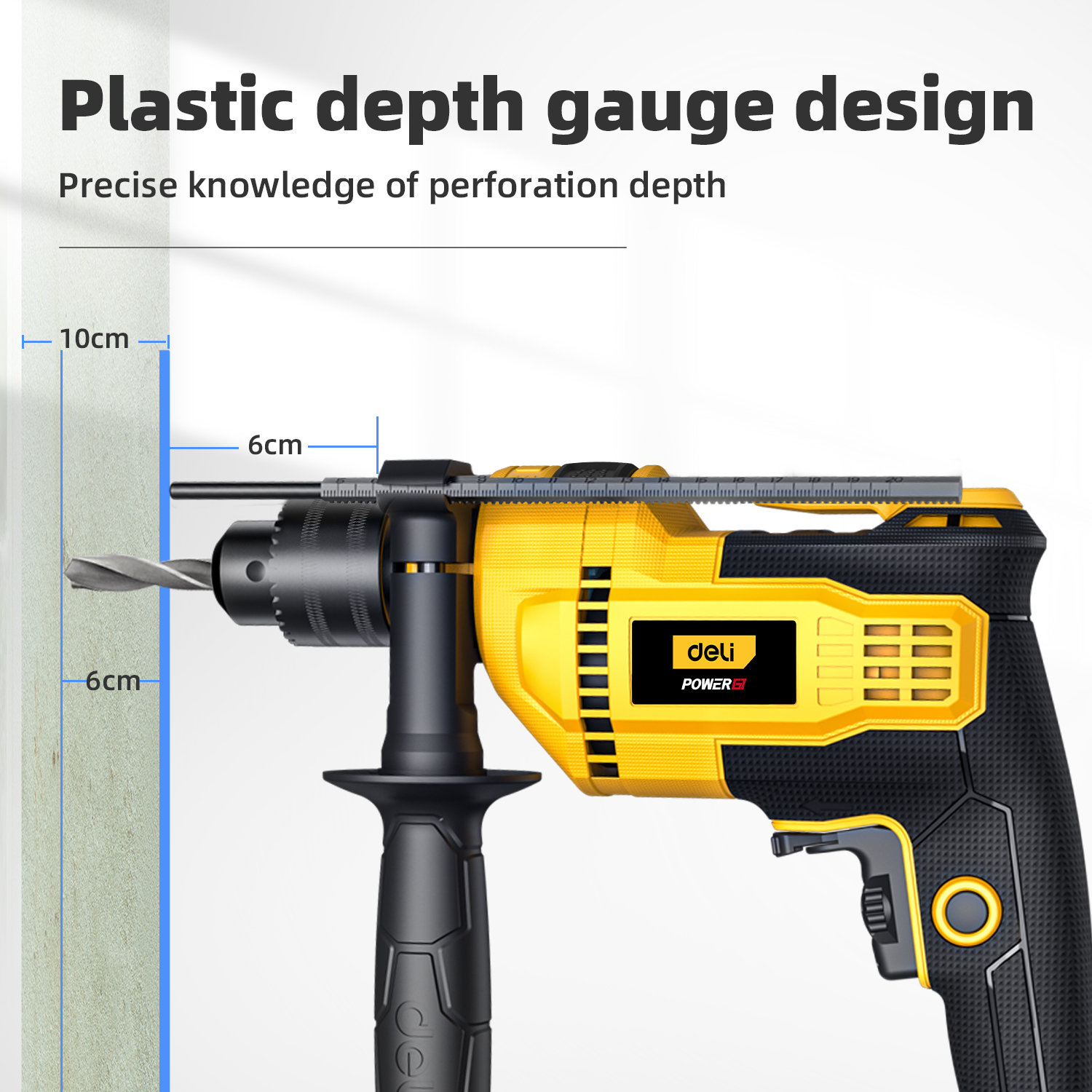Thiết kế công thái học: Tay cầm phụ đi kèm giúp bạn cầm máy vững chãi bằng cả hai tay, chống rung lắc và mỏi tay khi làm việc lâu. Thước đo độ sâu giúp bạn căn chỉnh chiều sâu lỗ khoan đều tăm tắp.