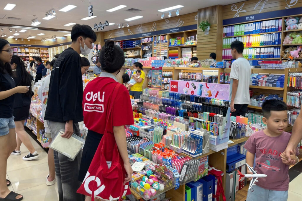 Phụ huynh tìm kiếm đồ dùng học tập cho con vào năm học mới. Ảnh: Deli